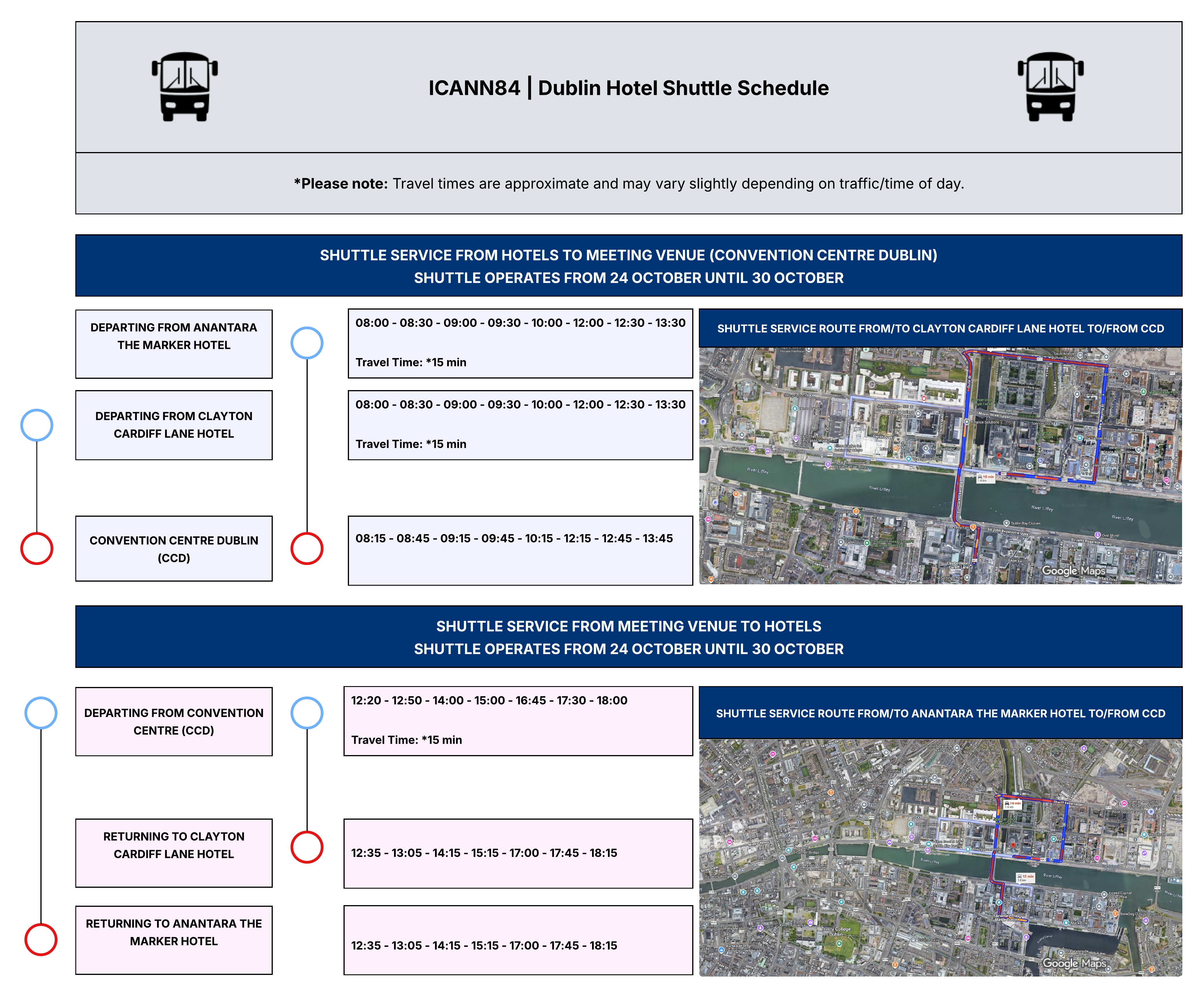 ICANN will provide shuttle service between Anantara The Marker Dublin Hotel and the Convention Centre Dublin (CCD). Shuttle Schedule